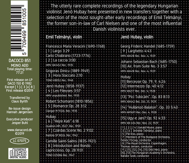 Danish violinist Emil Telmányi, son-in-law of composer Carl Nielsen, was one of the famous pupils of the Hungarian Jenö Hubay, himself close...