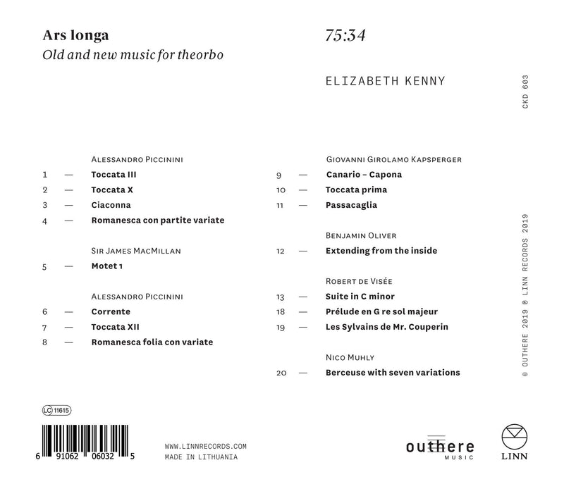 Ars longa see theorbo specialist Elizabeth Kenny perform a typically inventive recital of diverse repertoire spanning five centuries. The theorbo's eccentric appearance...