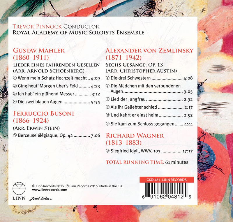 Historical performance pioneer Trevor Pinnock conducts the Royal Academy of Music Soloists Ensemble in chamber arrangements from Mahler to Zemlinksy. Mahler: Lieder...