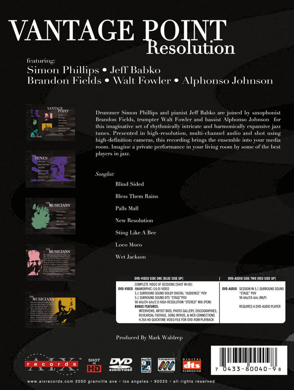 AIX RecordsRESOLUTIONToto and session drummer Phillips and Kimmel keyboardist Babko are featured performing lots of great jazz music. This disc has Multiple 5.1...