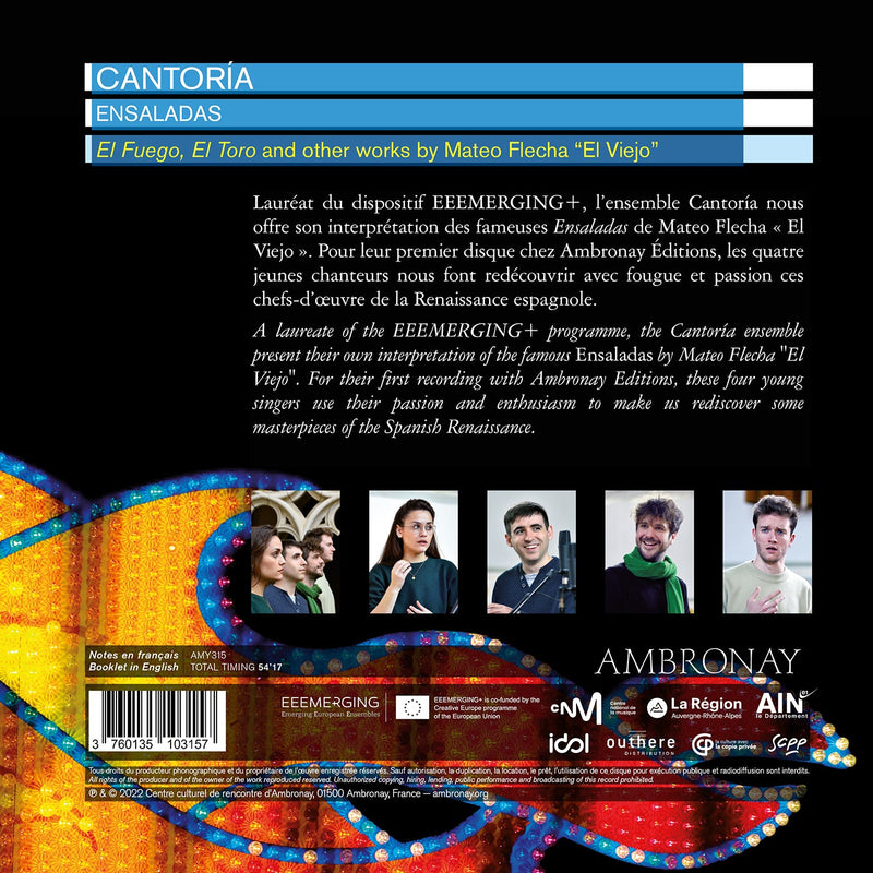 Ambronay EditionsFlecha: Ensaladas - Music of Renaissance Spain / CantoríaA laureate of the EEEMERGING+ program, the Cantoría ensemble present their own interpretation of the famous Ensaladas by Mateo Flecha "El Viejo"....