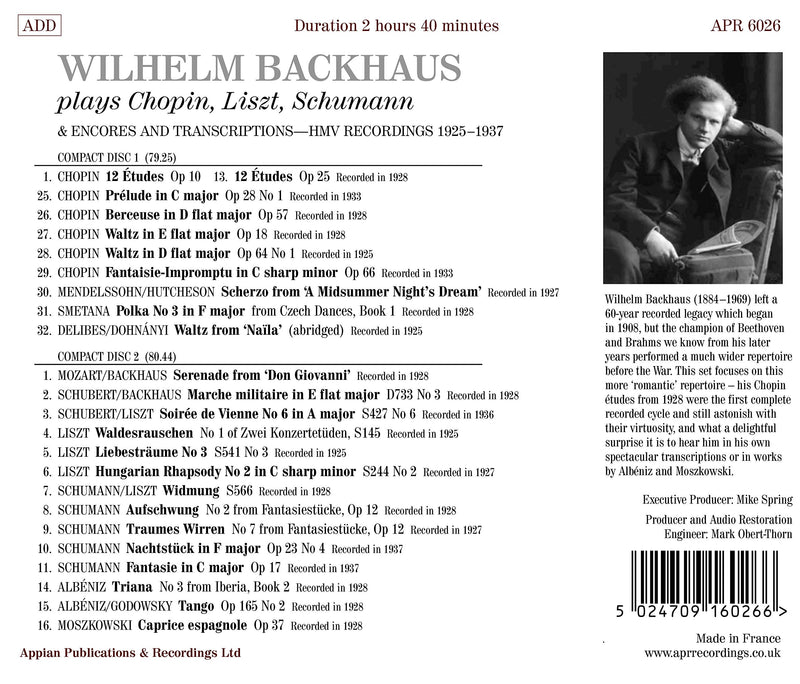 APRWilhelm Backhaus plays Chopin, Liszt, Schumann & Encore Pieces