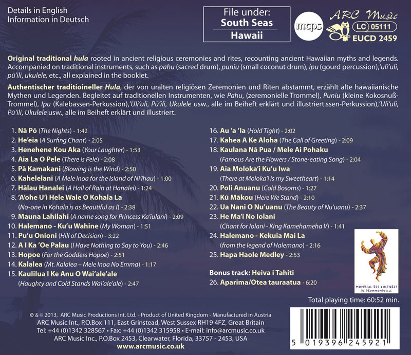 ARC MusicHawaii: Traditional HulaHawaii includes original Traditional hula rooted in ancient religious ceremonies and rites, recounting ancient Hawaiian myths and legends. Accompanied on Traditional instruments...