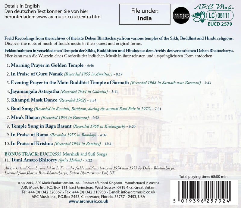 Field Recordings from the archives of the late Deben Bhattacharya from various temples of the Sikh, Buddhist and Hindu religions, recorded on...