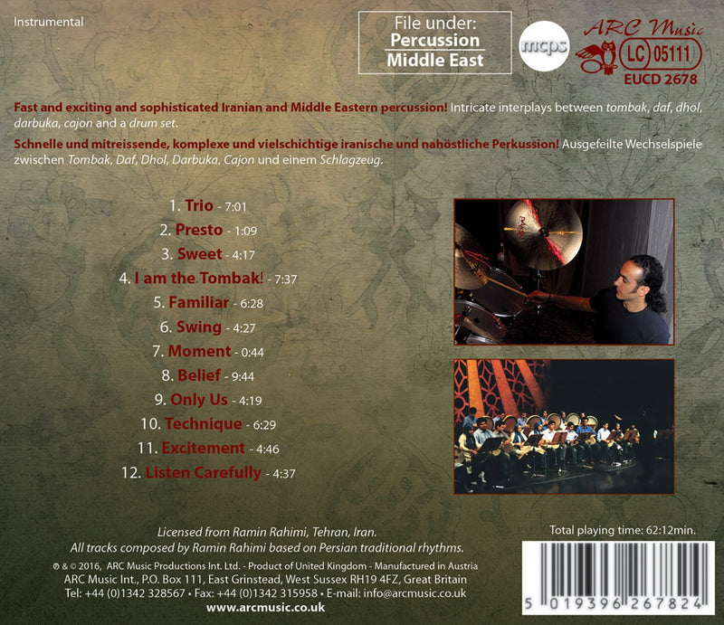 Each of these tracks features fast, exciting and sophisticated Iranian and Middle Eastern Percussion. The intricate rhythms and intriguing interplays between the...