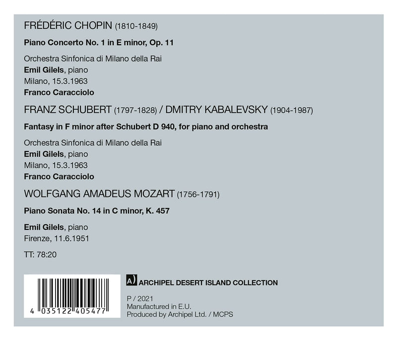 Newly released as part of the Archipel Desert Island Collection, this disc captures in concert one of the two greatest and most important of Russian pianists to emerge from the Soviet Union after WWII, Emil Gilels (1916-85). + From a March, 1963 Milan concert comes Chopin’s First Concerto and the Schubert/Kabalevsky re-imagined Fantasy in F minor, D940, an orchestrated version written specially for Gilels. + Also to be heard is a live 1951 performance from Firenze of Mozart’s C minor sonata, K457.