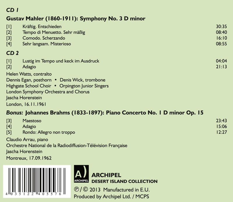 MAHLER Symphony No. 3 1. BRAHMS Piano Concerto No. 1 2 • Jascha Horenstein, cond; 1 Helen Watts (a); 1 Dennis Egan...
