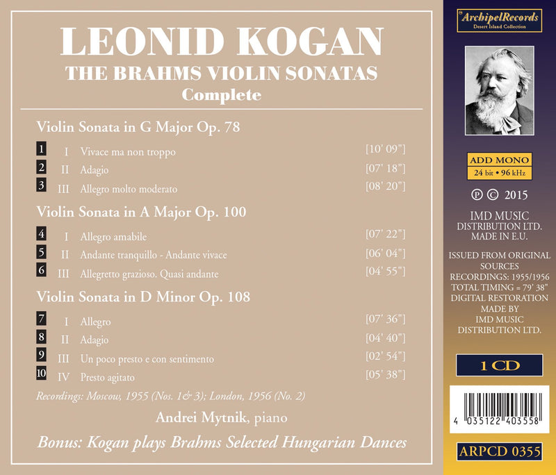 Leonid Kogan, accompanied by Andrei Mytnik will leave you speechless with these live recordings and radio broadcasts of Brahms' Violin Sonatas. Critics...