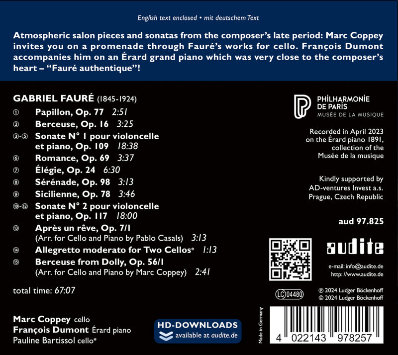 Audite MusikproduktionFauré authentique - Complete Works for Cello & Piano / Coppey, DumontGabriel Fauré, a master of song, piano, and chamber music, particularly appreciated the modulation-rich sound of the Érard grand piano. Its rich...