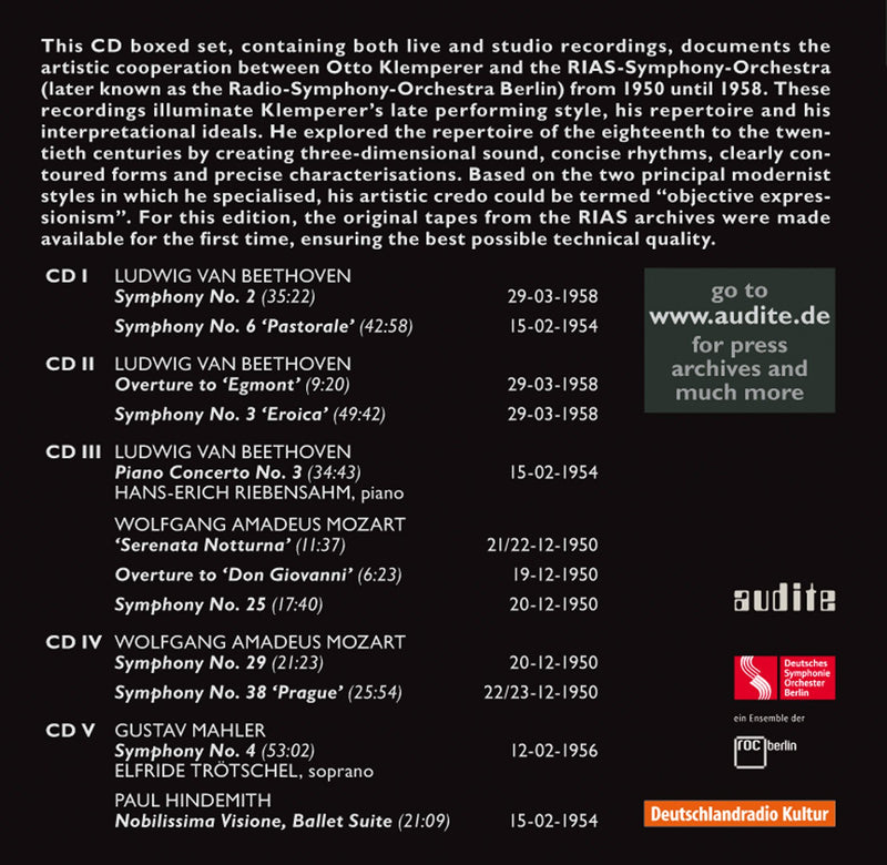 Following the Bach cantatas edition (audite 21.415) with Karl Ristenpart, audite continues the series of historic recordings from the archives of RIAS...