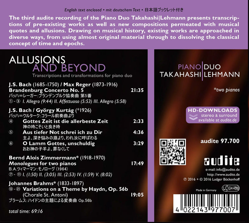 This debut audite album by the virtuoso PianoDuo Takahashi|Lehmann, focusing on three orchestral and ensemble masterpieces, explores the multifaceted cosmos of piano...