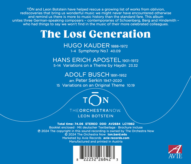 Avie RecordsThe Lost Generation - Apostel, Busch & Kauder / Botstein, The Orchestra Now