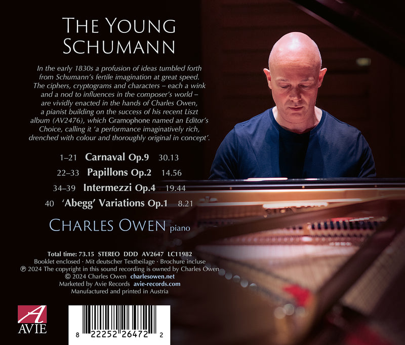 Avie RecordsThe Young Schumann / Charles OwenThe Young Schumann, the new release by British pianist Charles Owen, is a musical narrative of Robert Schumann's early career, featuring works...