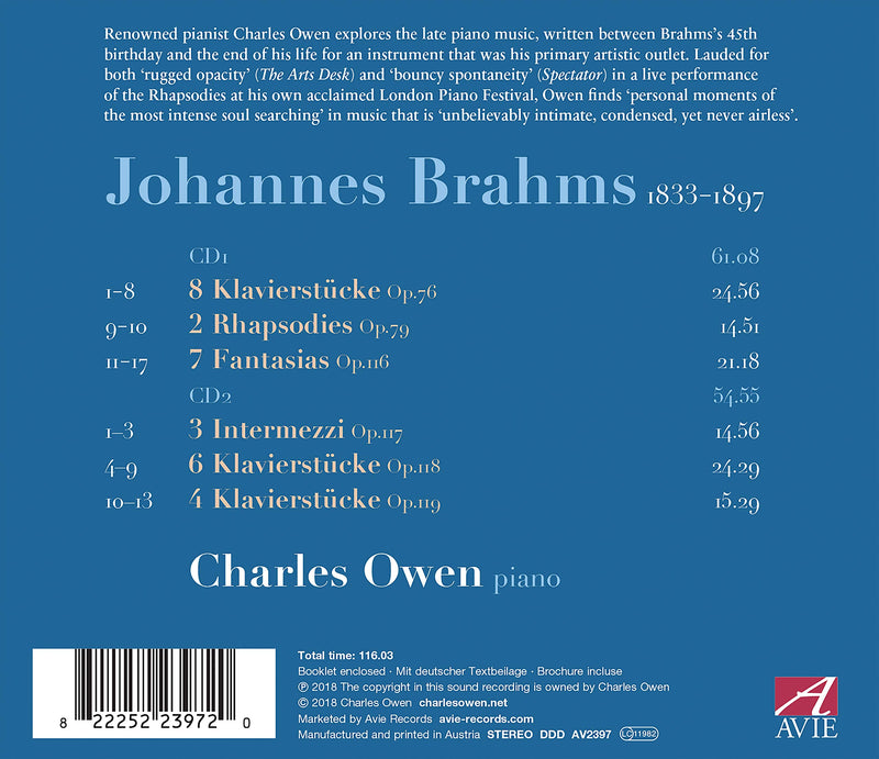 Avie RecordsBrahms: Late Piano Music Opp. 76, 79 & 116-119 / Owen