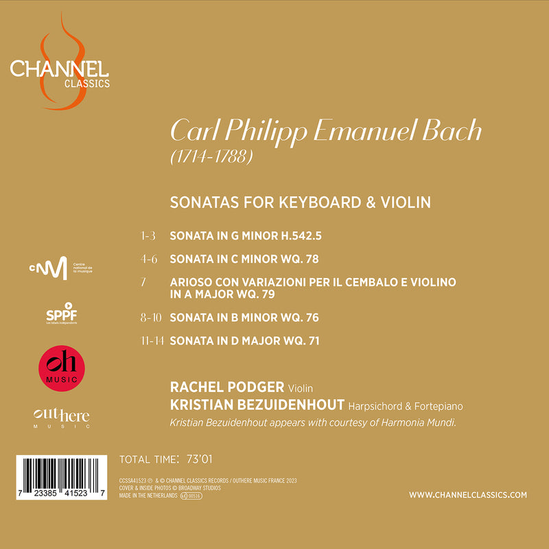 The Baroque dream team of Rachel Podger and Kristian Bezuidenhout interpret the astonishing music of C.P.E. Bach’s Violin Sonatas in C Minor, B Minor, D Major and G Minor. The two early sonatas here from the 1730s resemble the older style of his father. Listening to these works, you can imagine J.S. Bach glancing over Emanuel's shoulders while he wrote them as a teenager at home in Leipzig. The later sonatas, written 30 to 50 years later, reveal an emancipated composer whose developed musical language embodies the 'Empfindsamer Stil', the directly emotional and rhetorical style characteristic of northern-german music of the time.