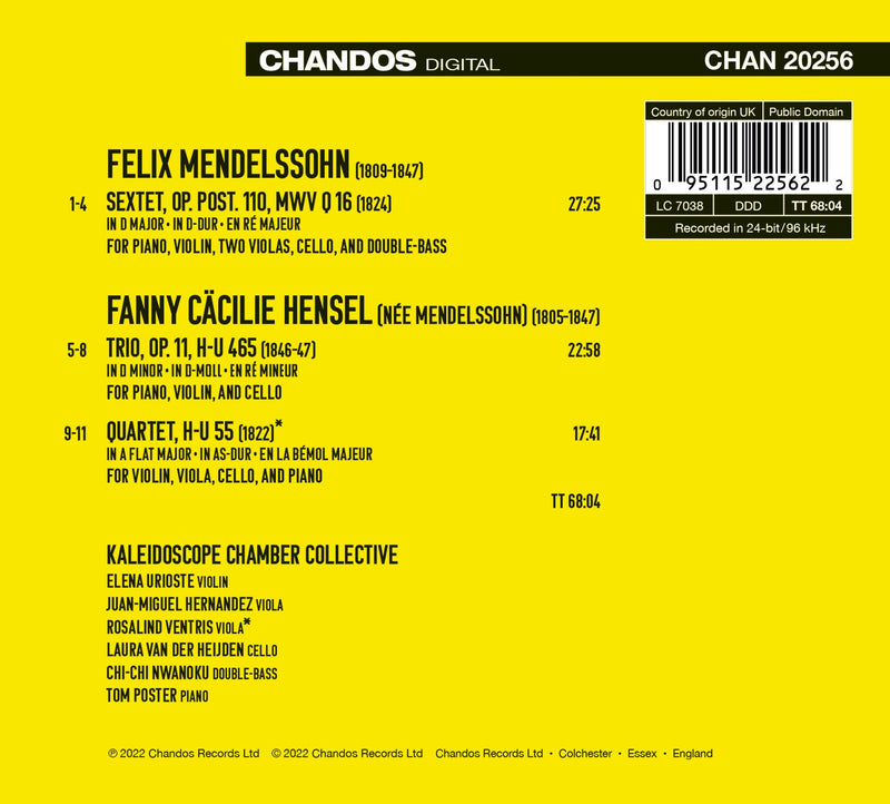 On SaleChandosFanny & Felix Mendelssohn: Chamber Music with Piano / Kaleidoscope Chamber CollectiveFanny Mendelssohn Hensel, born four years before her brother Felix, was an accomplished pianist and a prolific composer. When she died of...