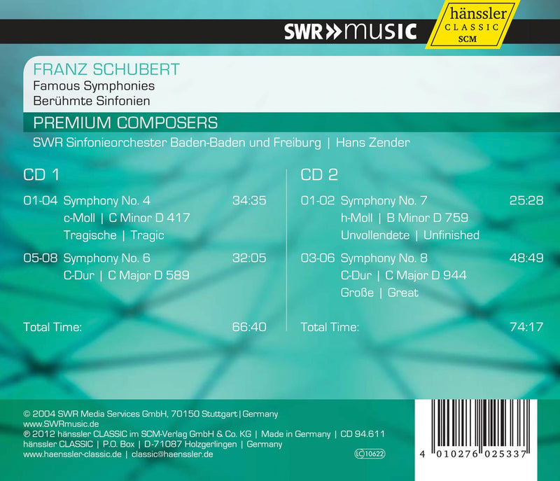 This latest release in the Premium Composers Series features a program of the most famous and most beautiful symphonies of Franz Schubert.