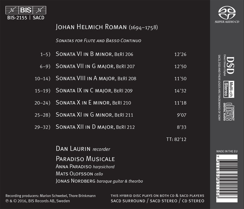 On SaleBISJ.H. Roman: The 12 Flute Sonatas, Nos. 6-12 / Laurin, Paradiso Musicale