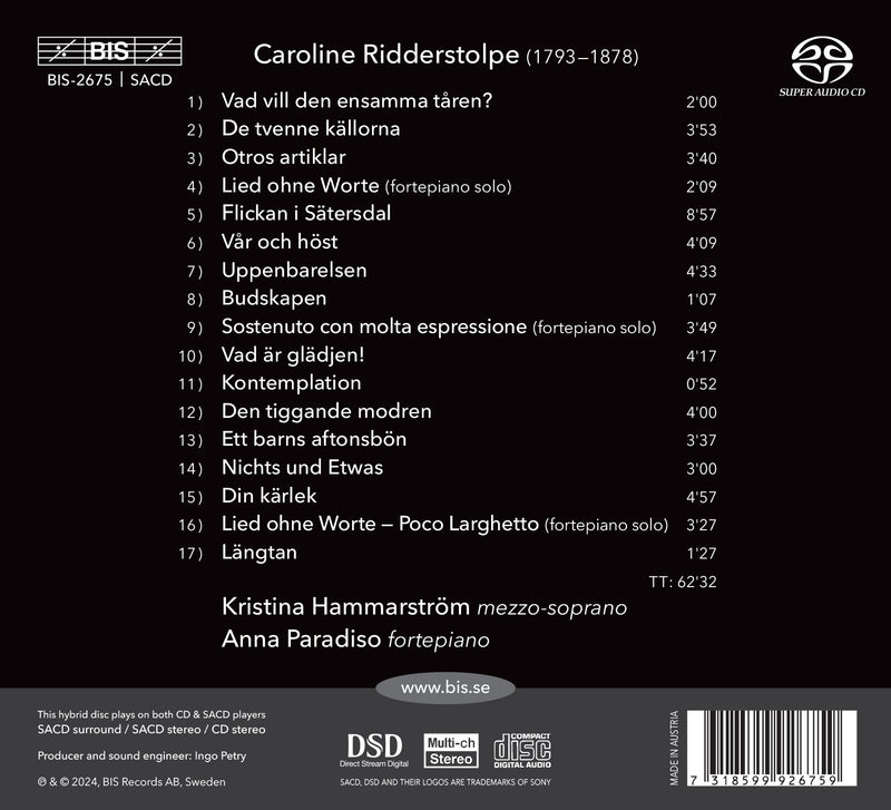 Caroline Ridderstolpe's music remained virtually unknown for almost 200 years, until Anna Paradiso rediscovered it as part of her research into nineteenth-century...