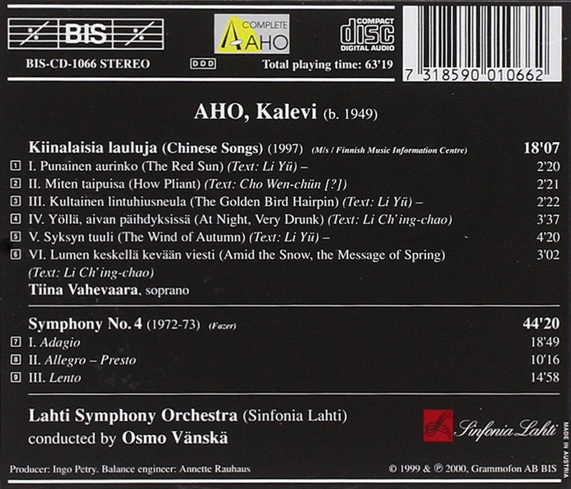BISAho: Chinese Songs; Symphony No. 4 / Vahevaara, Vänskä, Lahti Symphony