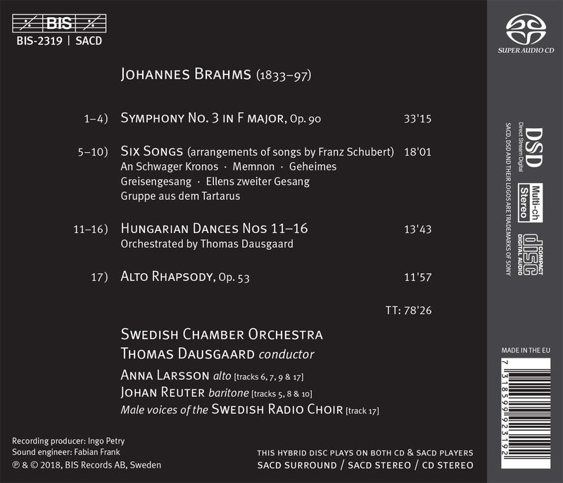 BISBrahms: Symphony No. 3, Alto Rhapsody & 6 Schubert Songs / Dausgaard, Larsson, Reuter, Swedish Chamber Orchestra