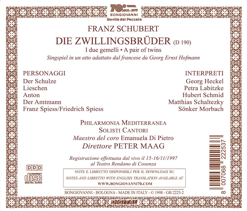BongiovanniSchubert: Die Zwillingsbruder / Maag, Solisti Cantori, Philharmonia Mediterranea