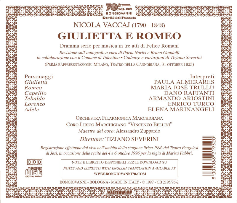 Premiering to great success in 1825, the Naples based composer Nicola Vaccaj's Giulietta e Romeo (Romeo and Juliet) enjoyed a brief period...