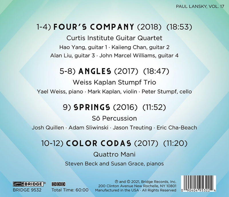 Paul Lansky's latest album brings together four virtuosic pieces, composed for widely varying ensembles. Four's Company for four guitars combines lyricism, rich...