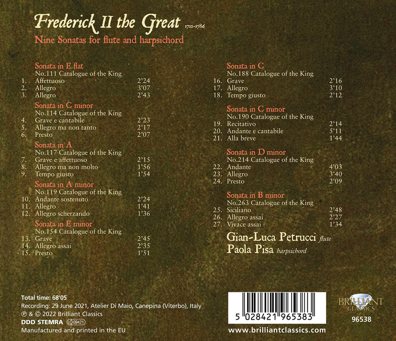 Brilliant ClassicsFrederick II the Great: 9 Sonatas for Flute & Harpsichord / Petrucci, Pisa