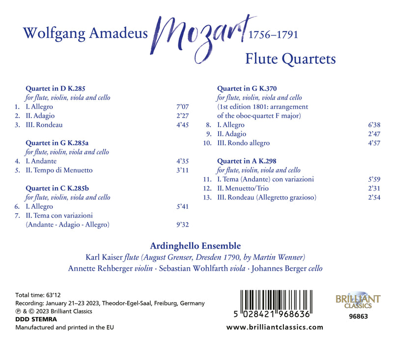 Three of these marvellous quartets for flute and string trio were composed in 1777/78 during Mozart’s first extended tour without his father....