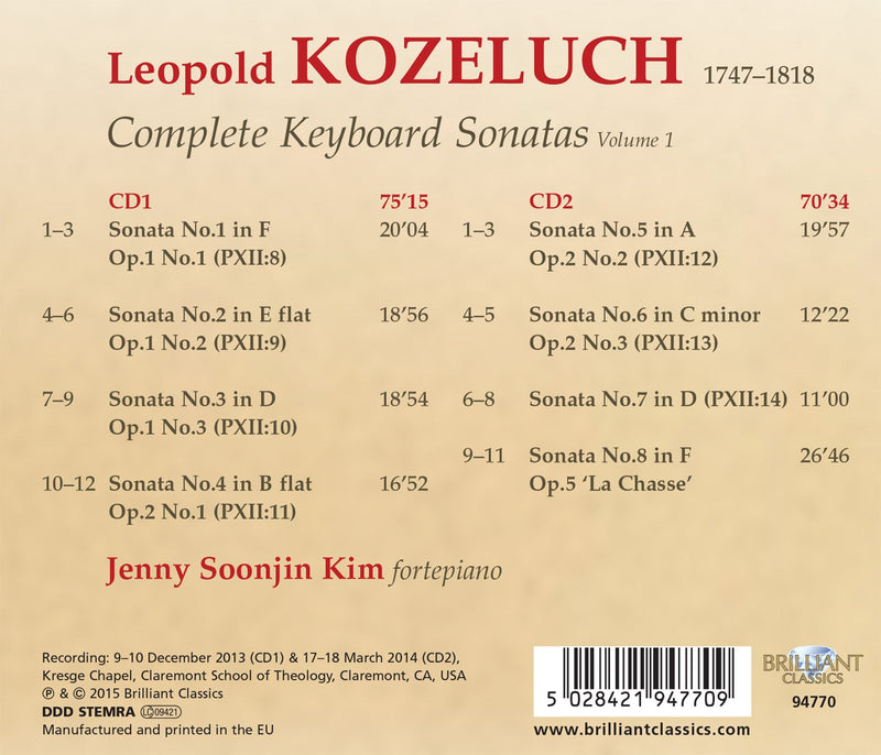 Brilliant ClassicsKozeluch: Complete Keyboard Sonatas Vol 1 / Jenny Soonjin Kim