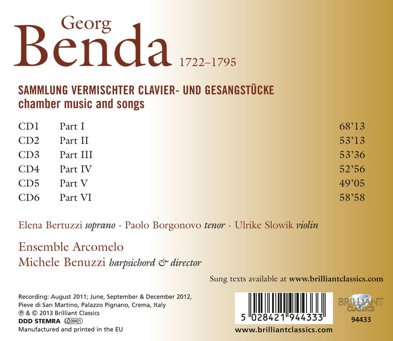 This 6 CD set contains a wealth of chamber music and songs. Bohemian composer Georg Benda achieved great fame in his time...