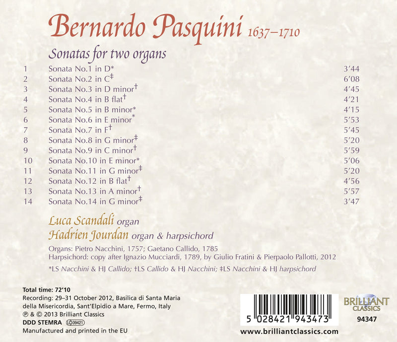 Brilliant ClassicsPasquini: Sonatas For Two Organs / Luca Scandali, Hadrien Jourdan
