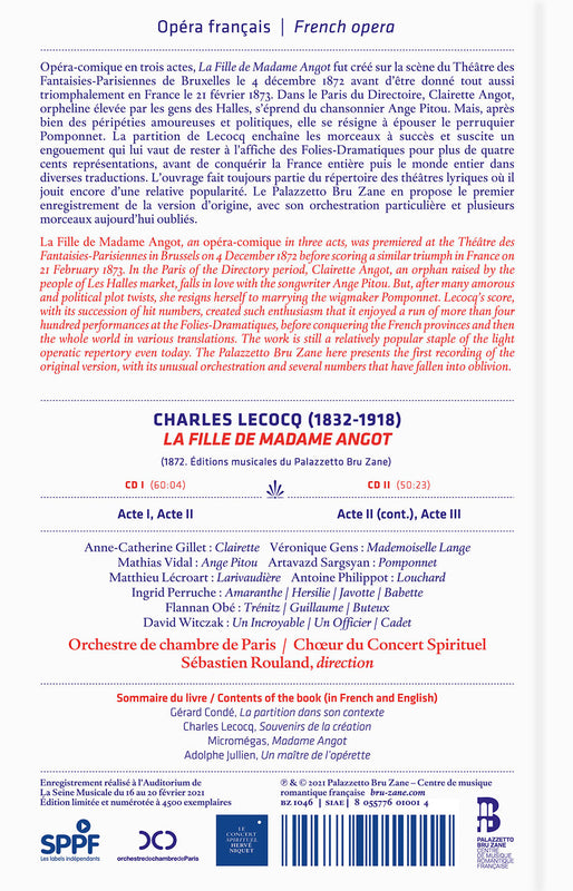Bru ZaneLecocq: La fille de Madame Angot / Rouland, Orchestre de Chambre de ParisLa Fille de Madame Angot, an opéra-comique in three acts, was premiered at the Théâtre des Fantaisies-Parisiennes in Brussels on 4 December...