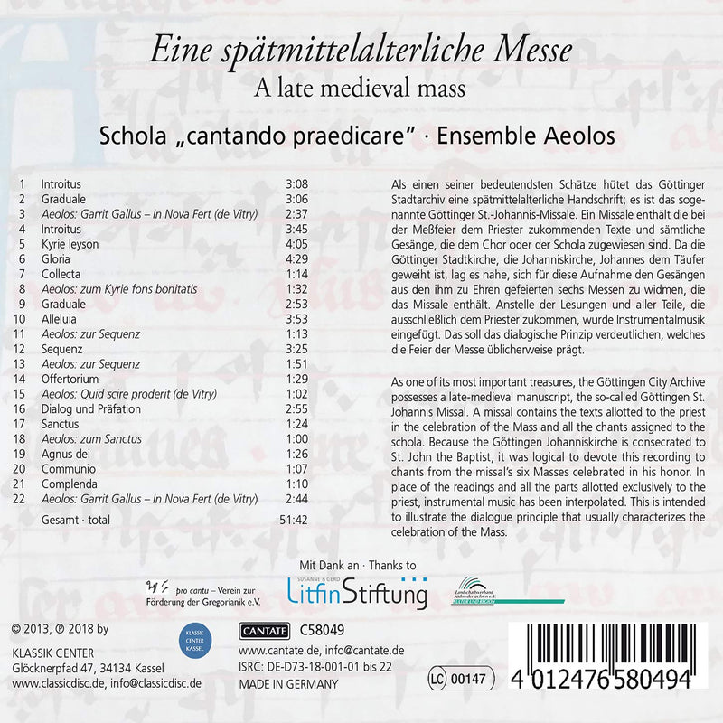 CantateA Late Medieval Mass / Aeolos, Schola Cantando PraedicareOne of the most important treasures of the Göttingen City Archives is a late medieval manuscript; it is the so-called Göttingen St....