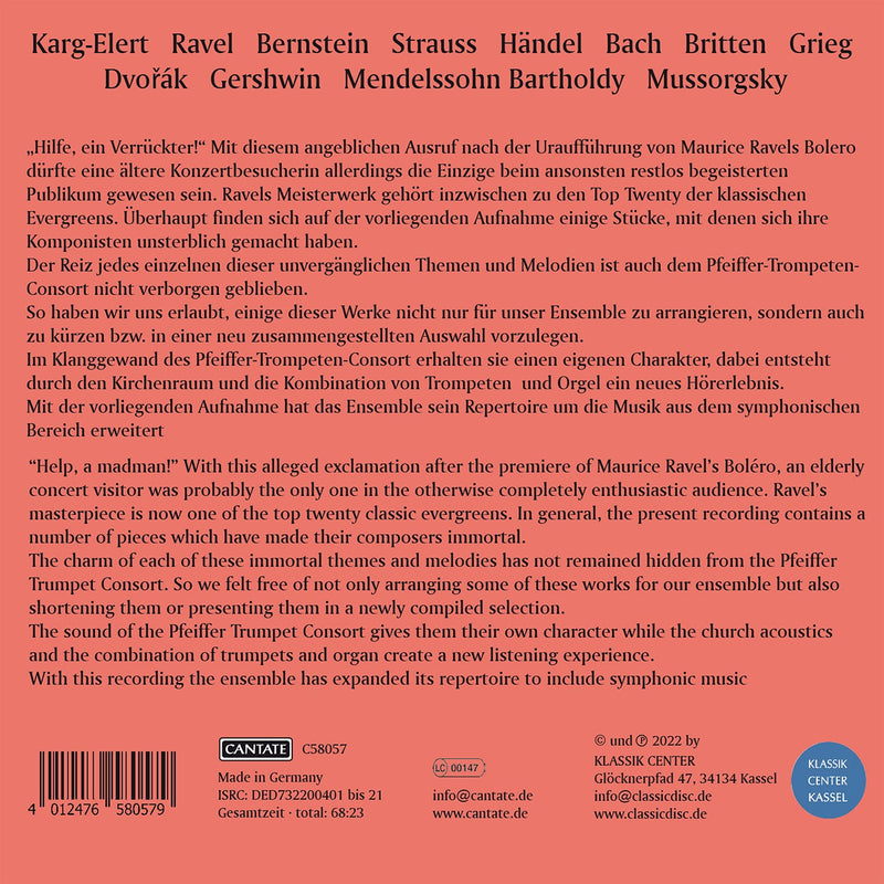 On SaleCantatePetit Bolero - Music for Trumpets, Percussion & Organ / Pfeiffer Trumpet ConsortImmortal themes and melodies in charming arrangements for brass, organ and timpani. Recorded in great church acoustics to a new and breathtaking...