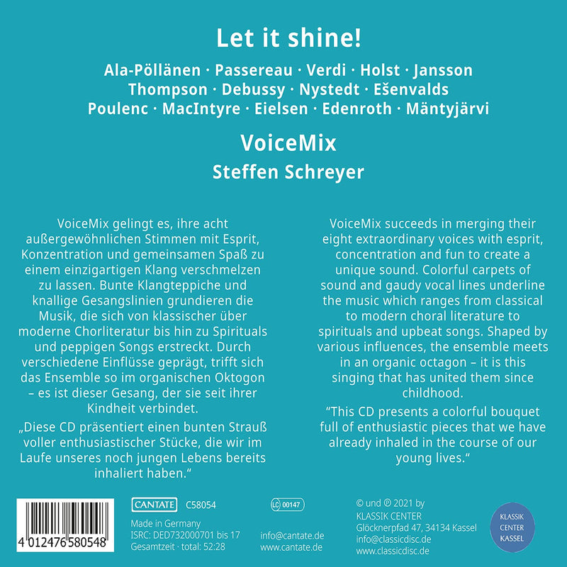 VoiceMix succeeds in merging their eight extraordinary voices with esprit, concentration and fun to create a unique sound. Colorful carpets of sound...