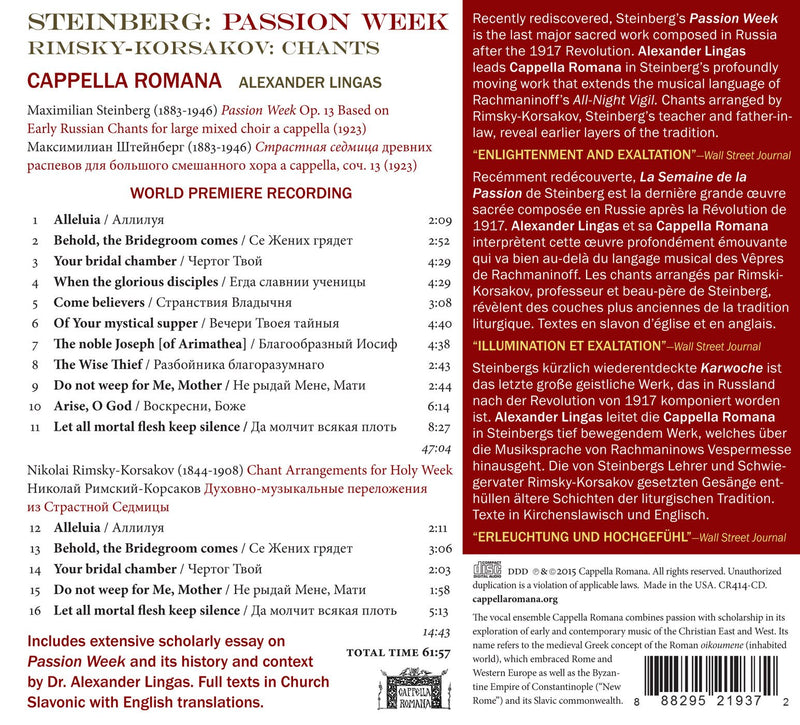 Cappella RecordsSteinberg: Passion Week; Rimsky-korsakov: Chants For Holy Week / Lingas, Cappella RomanCappella Romana presents the last major sacred work composed in Russia after the imposition of Communism: Passion Week by Maximilian Steinberg. Born...