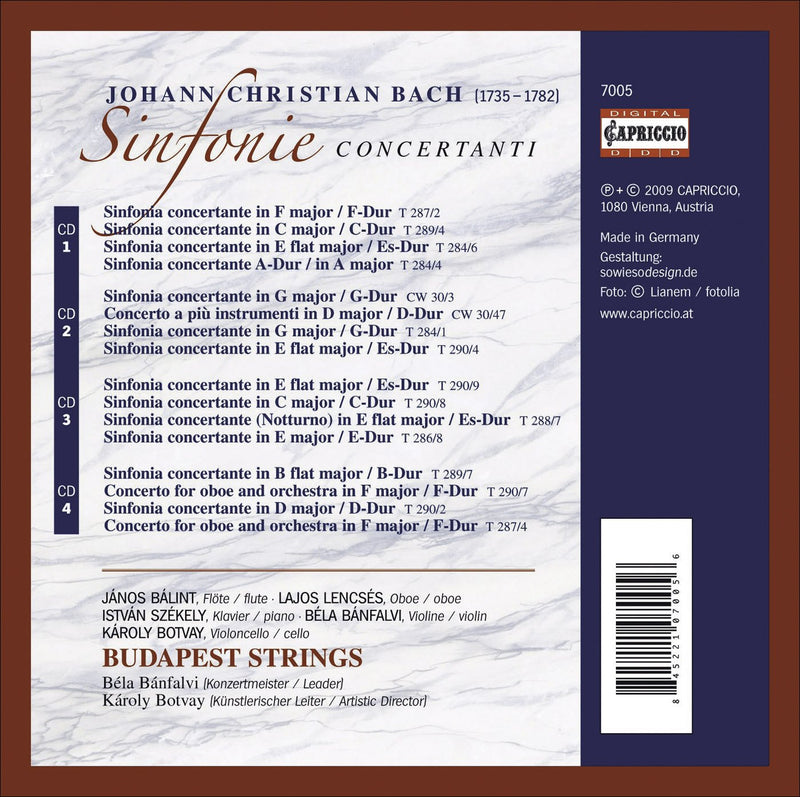 CapriccioJ. C. Bach: Sinfonie Concertanti / Budapest StringsSinfonie concertanti and several concertos by J.C. Bach are exceptionally well played by the Budapest Strings with fine soloists... The work where...