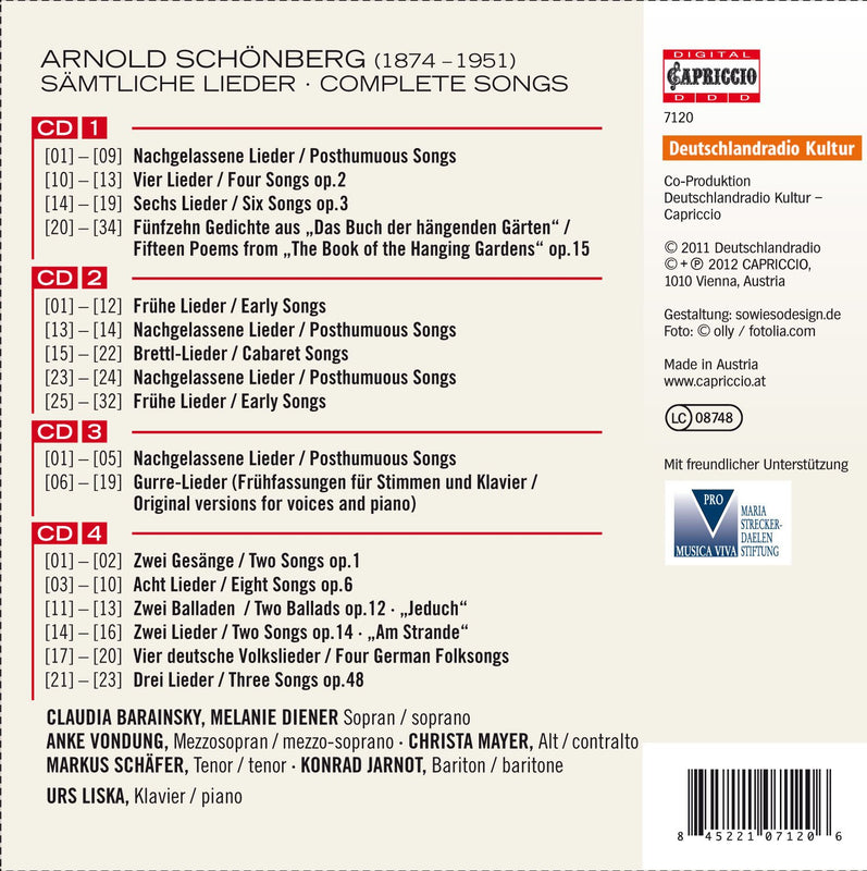 CapriccioSchoenberg: Complete Songs For Voice & Piano / Barainsky, Diener, Vondung, Mayer, Jarnot, Schafer, LiskaClaudia Barainsky & Melanie Diener (sopranos), Anke Vondung (mezzo-soprano), Christa Mayer (contralto), Konrad Jarnot (baritone), Markus Schäfer (tenor), Urs Liska (piano)
