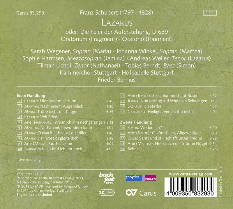 "•After the prize-winning first recording of Franz Schubert’s opera Sakontala, Frieder Bernius has now turned to his oratorio Lazarus (D 689). •...