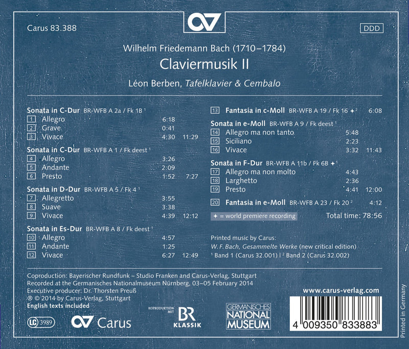 CarusW.F. Bach: Claviermusik, Vol. 2Wilhelm Friedemann Bach (1710-84) was one of the most outstanding, yet at the same time, most idiosyncratic composers of his time. His...