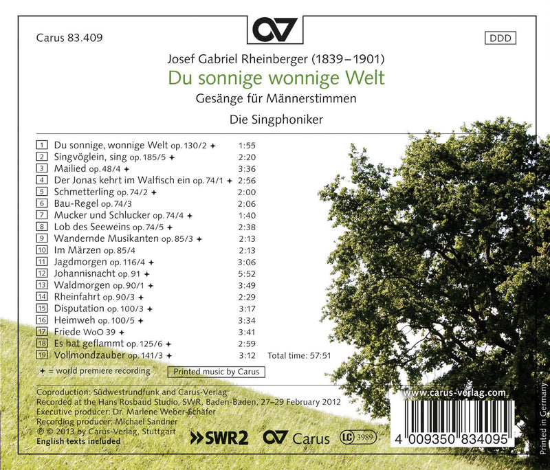 CarusRheinberger: Du sonnige wonnige Welt - Secular works for menRheinberger's works for men's choir are among the best of this genre in the second half of the 19th century. The performance...