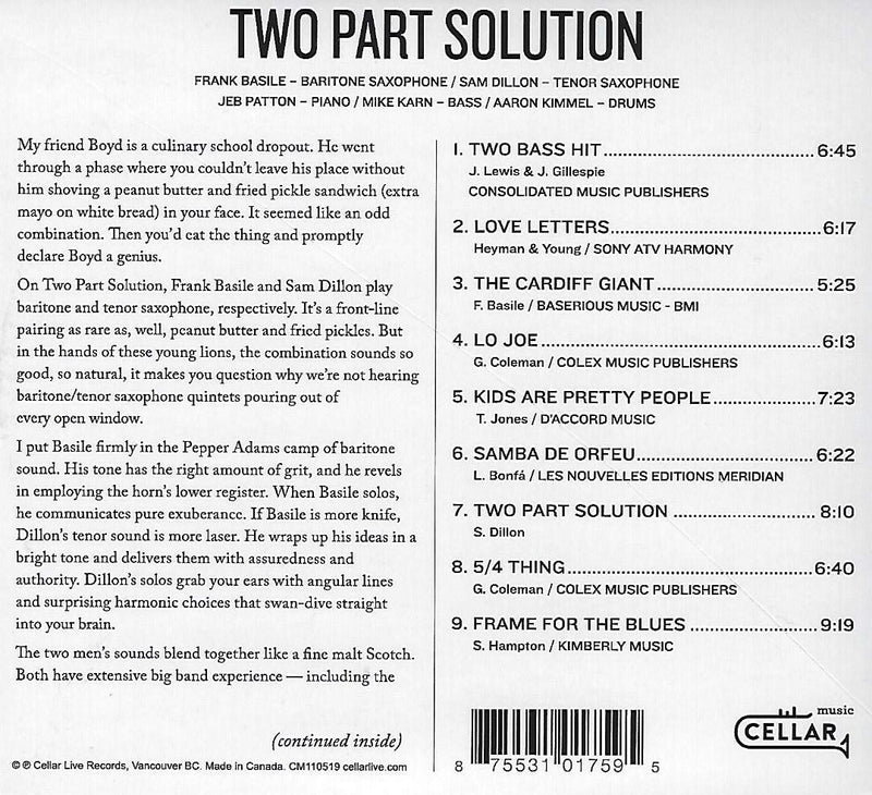 CELLAR LIVE2 PART SOLUTIONOn Two Part Solution, Frank Basile and Sam Dillon play baritone and tenor saxophone, respectively. It's a front-line pairing as rare as,...