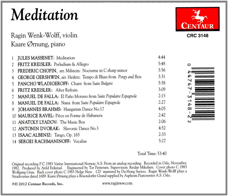 Meditation is a collection great works of a contemplative nature from the violin repertoire.