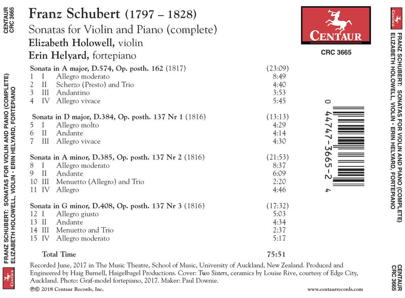 This album includes the complete Franz Schubert Sonatas for Violin and Piano, performed on period instruments. Elizabeth Holowell is an eminent teacher...