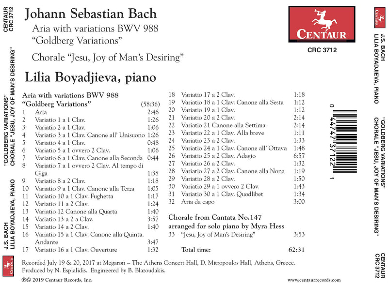 Centaur RecordsBach: Goldberg Variations & Chorale, "Jesu, Joy of Man's Des
