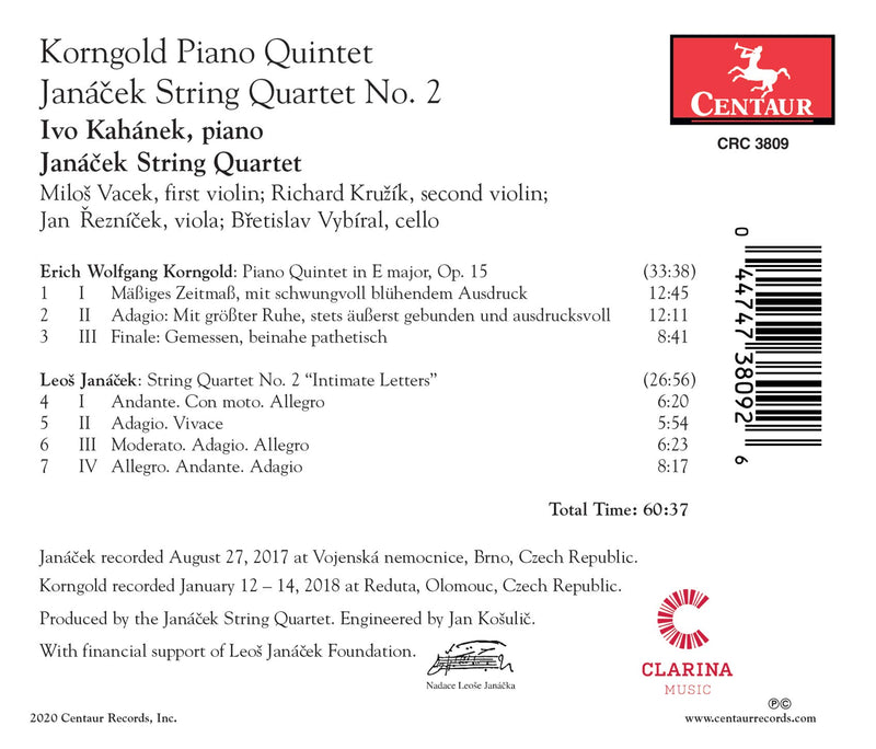 Centaur RecordsKorngold: Piano Quintet - Janaček: String Quartet No. 2 / Ivo Kahanek, Janaček Quartet