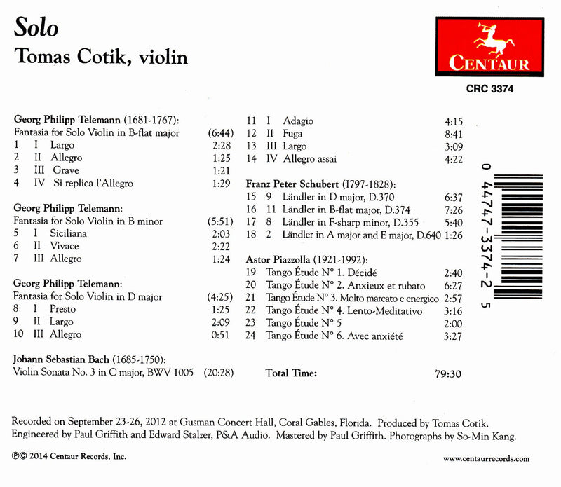 The spotlight is on Argentinean native Tomas Cotik in this program of works for solo violin by Telemann, Bach, Schubert and fellow...