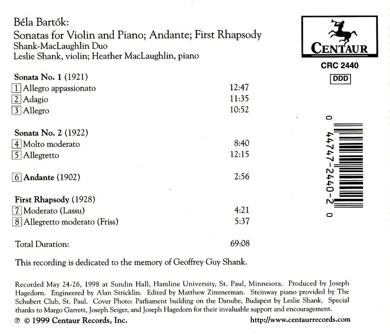 Bartok's wonderful works for violin and piano. Great performances by Leslie Shank and Heather MacLaughlin.